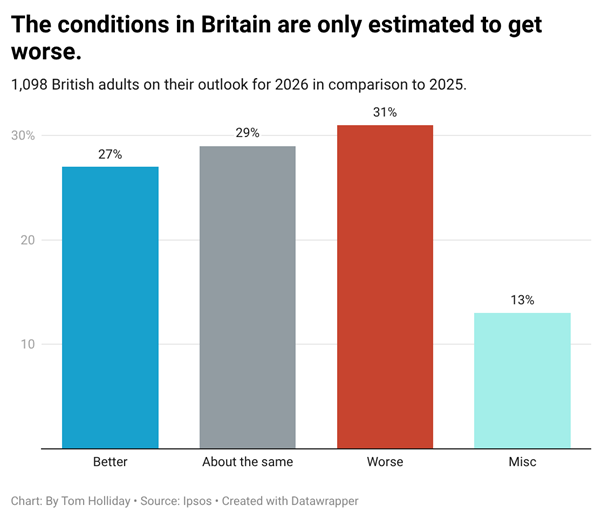 According to a December 2025 survey by Ipsos, 31 per cent of British adults feel worse about the forthcoming year, compared with 2025. This comes in the majority to 27 per cent of British adults who believe it will be better and 29 per cent who believe it will remain the same.